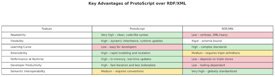ProtoScript isn't merely a static specification for ontological data; it's a fully capable programming language with executable logic, methods, inheritance, and rich integration capabilities. Unlike XML or RDF, which can only describe data structures, ProtoScript prototypes can include functional behaviors, dynamic operations, and complex logic directly within the ontology definitions themselves. Furthermore, ProtoScript seamlessly interfaces with C#, enabling the invocation of external libraries, complex business logic, or algorithmic code directly from within prototypes. Conversely, C# applications can dynamically instantiate, manipulate, and execute ProtoScript-defined ontological structures. This powerful two-way integration significantly enhances flexibility, enabling dynamic ontology adaptation, real-time semantic reasoning, and interactive workflows unattainable with traditional data-only ontology representations.