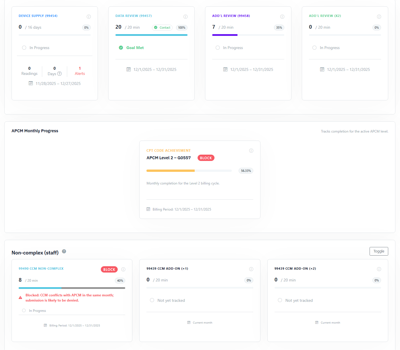 Read the RTM Guide →Calendar-month operations for CCM: consent, initiating visit, care plan requirements, time counting, and concurrency rules.